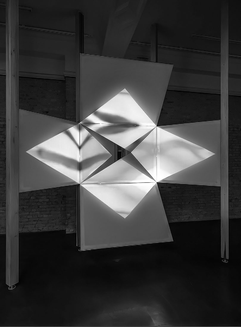 Работа «Прошлое – это мираж, который я оставил далеко позади» была заказана лондонской галереей Уайтчепел в качестве сайт-специфической инсталляции на первом этаже, показывать которую планировали в течение года. Она состояла из семи призматических конструкций, которые, будучи сделанными из зеркального стекла, дерева и холста, служили поверхностями для проекции фильмов. У каждой конструкции было свое название – «Экран для наблюдения за абстракциями номер один», «Экран для наблюдения за абстракциями номер два» и так далее – и своя форма. Так, в одной прямоугольная деревянная рама соединяла кусок холста наверху и кусок стекла внизу – состыковываясь посередине, они отходили от зрителя под углом в 45 градусов и образовывали вогнутую V-образную форму. В другой конструкции прямоугольный лоскут холста был с двух сторон обрамлен зеркалами, поставленными под прямым углом друг к другу. В третьей, более причудливой, в центре находилась пирамида из зеркал, к основанию которой со всех сторон были прикреплены прямоугольные лоскуты ткани.
